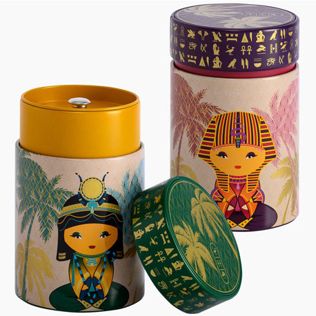 Lata redonda, con tapa a presión, para conservar 150 gr. de té. 7,5cm diámetro. 11,7cm alto. 2 modelos.